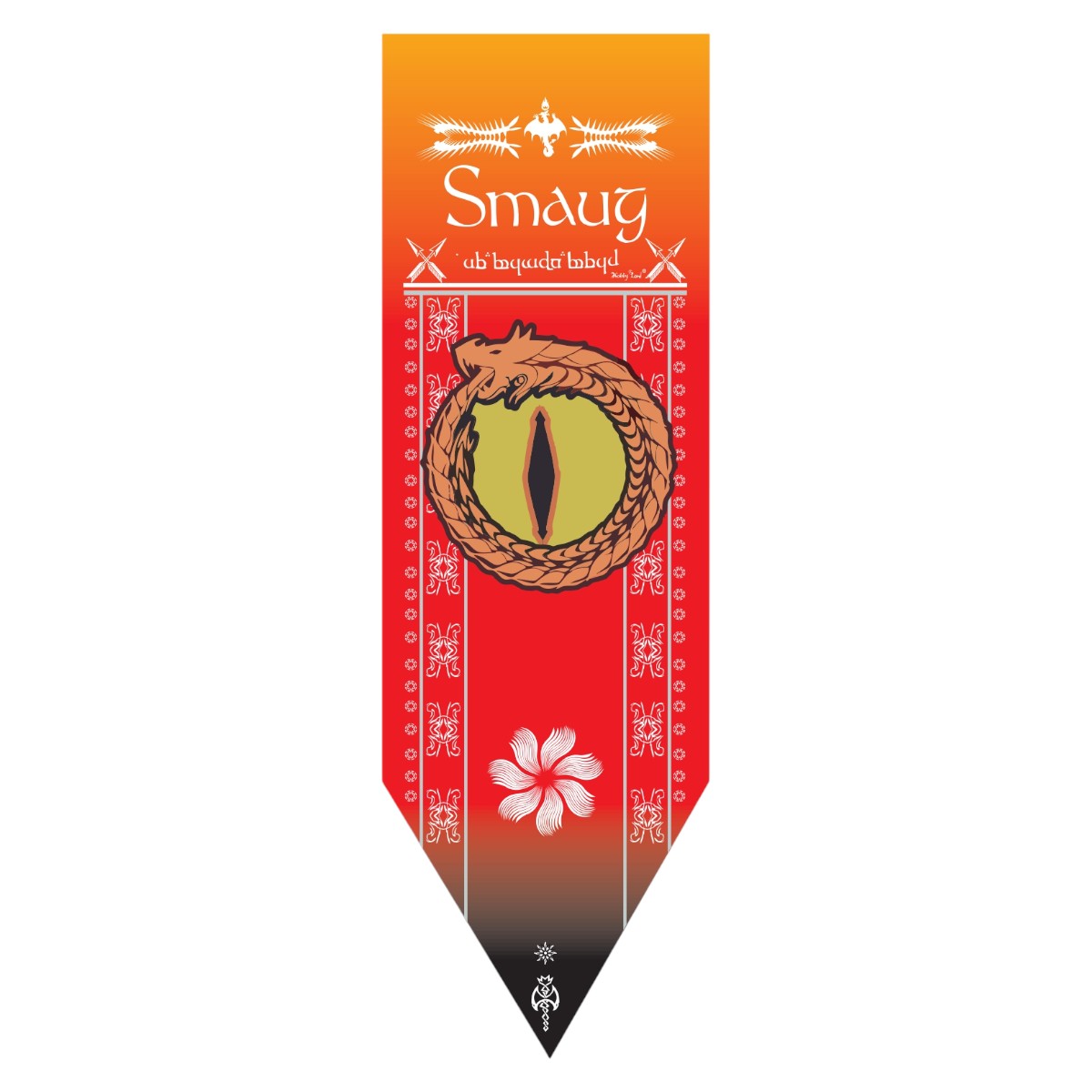 📜 Um brasão que exala ganância e destruição: Esta flâmula representa Smaug, o lendário dragão que tomou Erebor e espalhou terror sobre as terras próximas. Uma figura icônica do universo de Tolkien, símbolo de poder avassalador e cobiça incalculável.