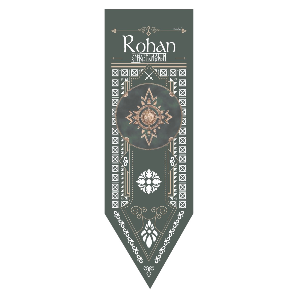 📜 Um brasão que cavalga a lenda: Esta flâmula representa Rohan, o reino dos Cavaleiros de Edoras. Com o cavalo branco galopante sobre fundo verde, o símbolo de Rohan expressa liberdade, coragem e honra no campo de batalha.