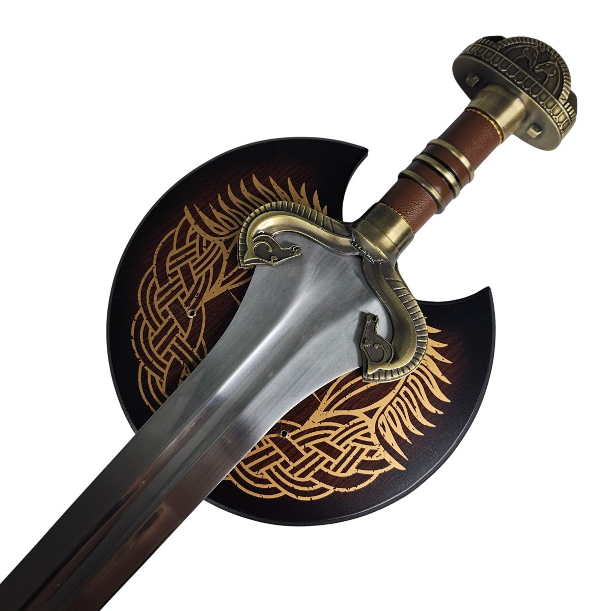 Com visual elegante e acabamento medieval, a peça foi desenvolvida para colecionadores, fãs de Tolkien e apaixonados por decoração temática. Sua composição une uma lâmina em aço 440, empunhadura com detalhes em corino e um suporte em madeira que valoriza ainda mais a exposição.