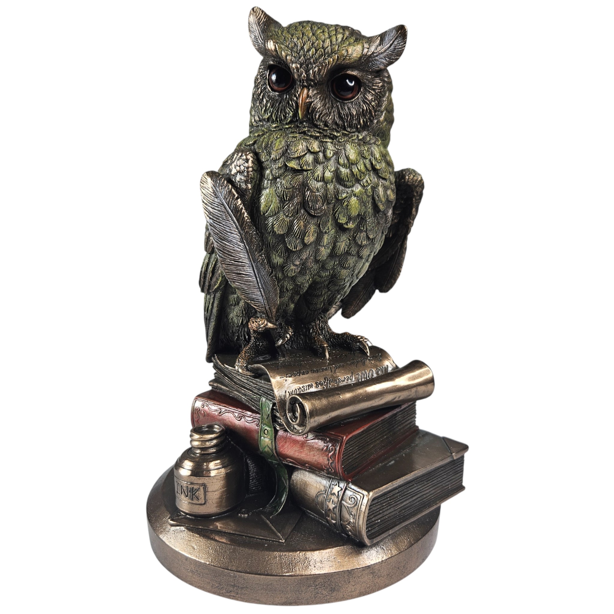 Uma peça perfeita para quem ama símbolos de conhecimento, estudo e mistério. Esta estátua traz uma coruja ricamente detalhada, pousada sobre livros, pergaminho e um tinteiro, com acabamento de aparência metálica e pintura em tons que valorizam as penas e os relevos.