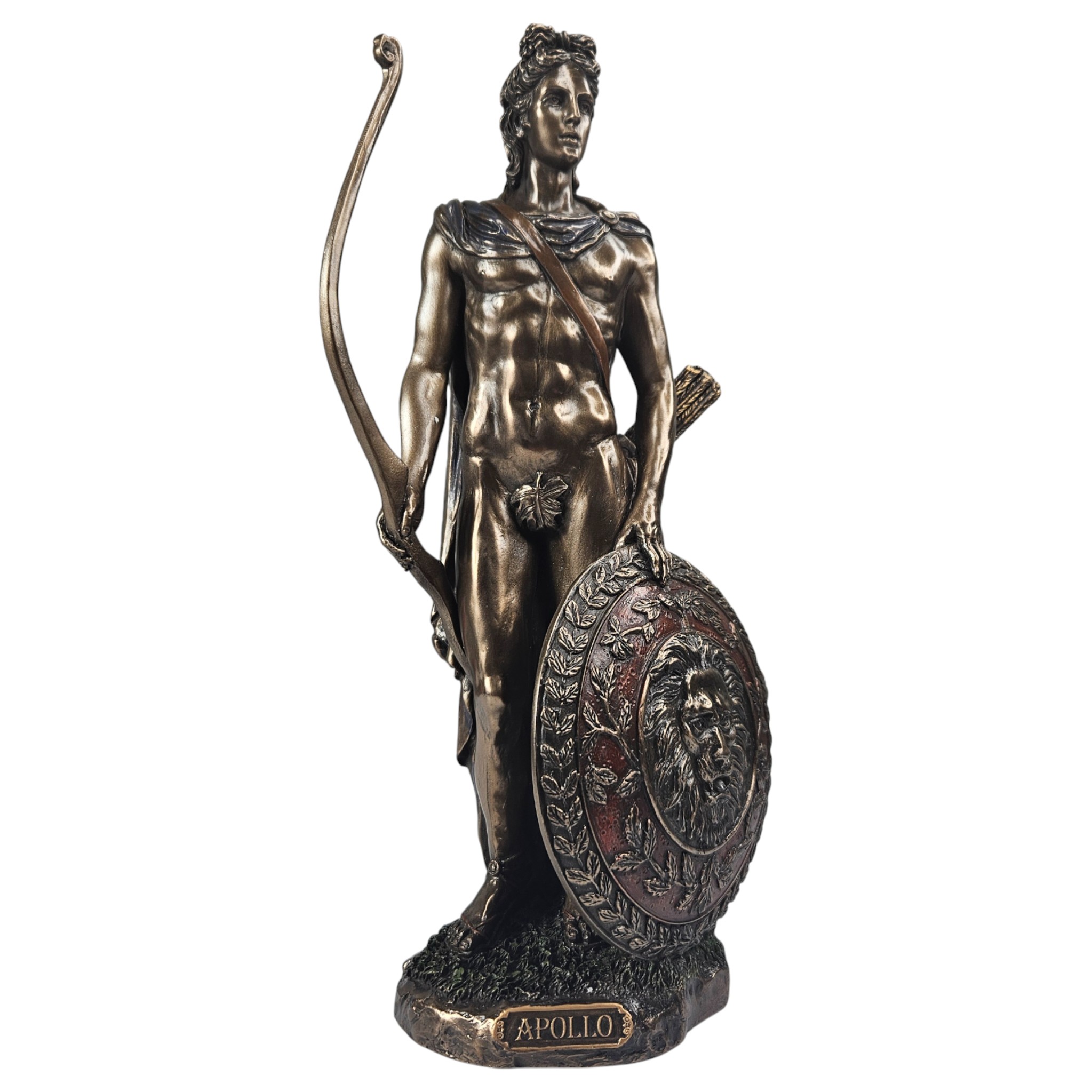 Deus grego ligado à luz, à música, às artes e à profecia, filho de Zeus e Leto e irmão gêmeo de Ártemis — ganha forma em uma escultura imponente, com presença de vitrine e acabamento metálico que valoriza cada detalhe.