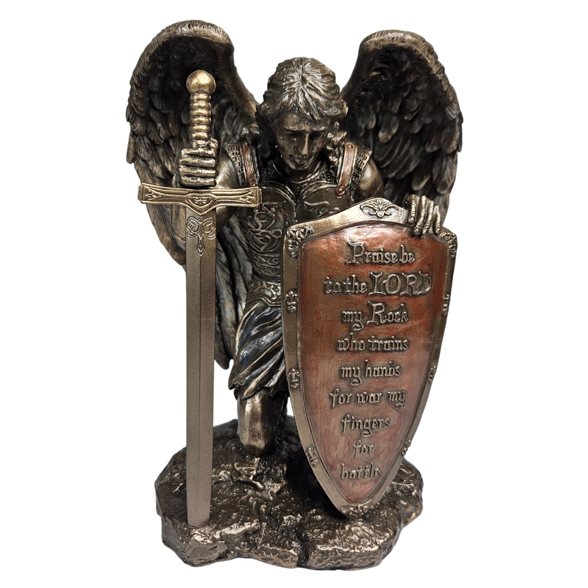 Uma peça marcante de fé, proteção e força: o Arcanjo Miguel aparece ajoelhado em posição de guarda, com as asas abertas, espada em destaque e escudo com inscrição em inglês em alto-relevo. O acabamento com aparência metálica e os detalhes do relevo trazem muita presença para a decoração.