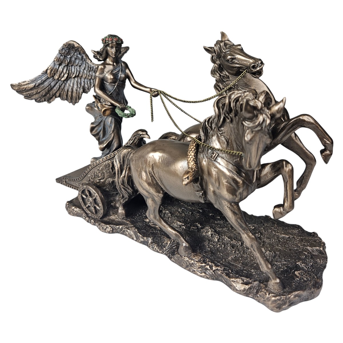 Deusa grega da vitória, símbolo de conquista, glória e triunfo — ganha forma em uma escultura imponente, com presença de vitrine e acabamento metálico que valoriza cada detalhe.