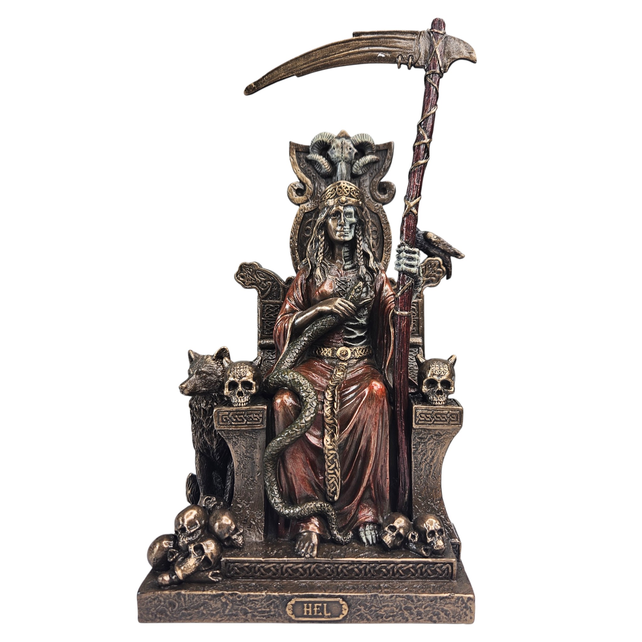 Deusa nórdica do reino dos mortos, filha de Loki e soberana de Helheim — ganha forma em uma escultura imponente, com presença de vitrine e acabamento metálico que valoriza cada detalhe.