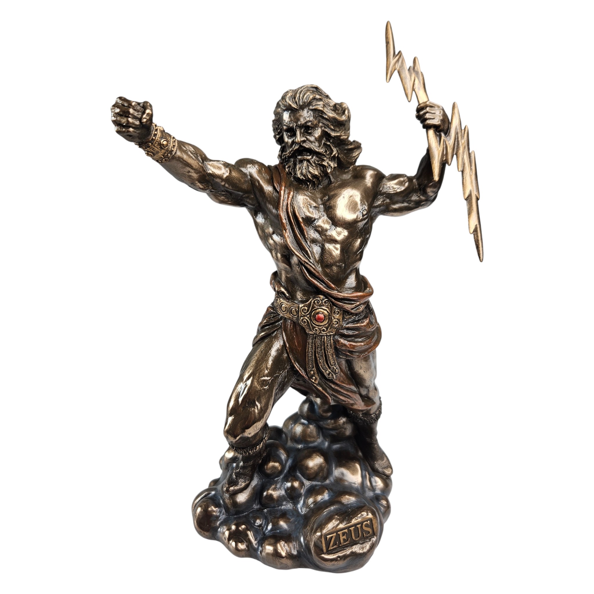 ZEUS — o rei dos deuses do Olimpo na mitologia grega — surge em uma pose poderosa, erguendo o raio e pisando sobre nuvens, como símbolo do domínio sobre o trovão e a ordem divina. O acabamento de aparência metálica valoriza os volumes do corpo, a expressão marcante e os detalhes do traje.