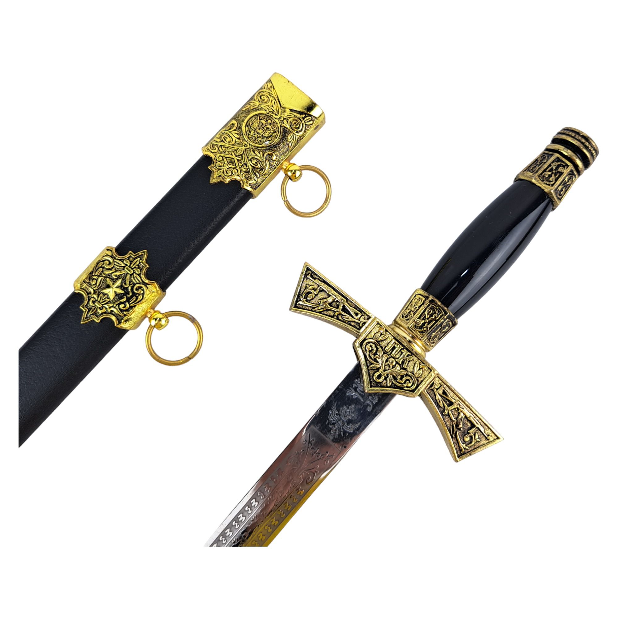 Adaga decorativa com lâmina gravada em baixo-relevo e bainha revestida em couro sintético. Ideal para decoração, coleção ou cosplay.