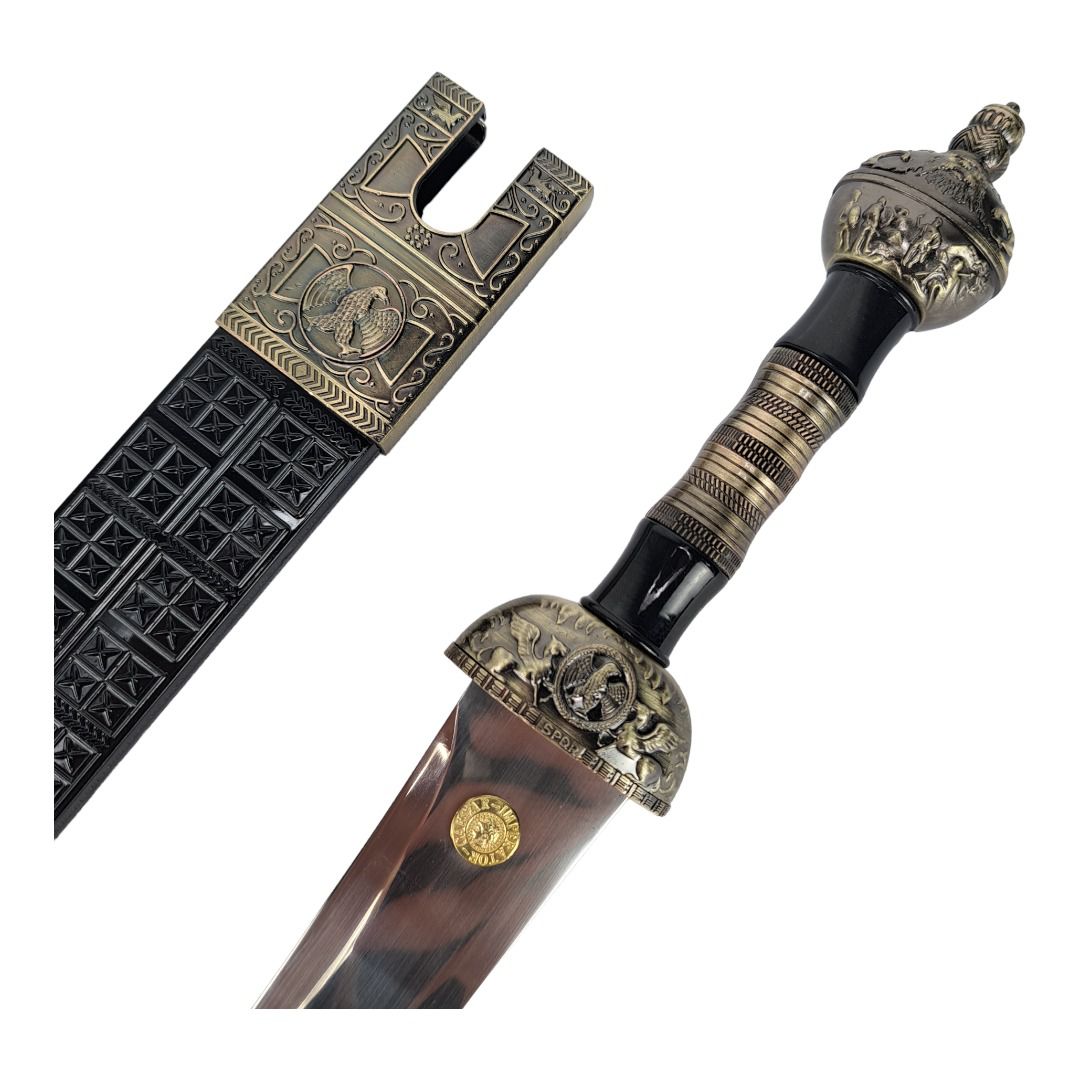 Adaga inspirada no gládio romano, arma icônica da antiguidade. Possui lâmina em aço, cabo e bainha em ABS com detalhes metálicos. Ideal para decoração, coleção ou cosplay.