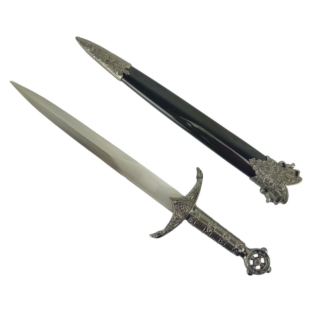 Inspirada na lenda de Robin Hood, essa impressionante adaga remete à era medieval e às cruzadas, capturando a essência do lendário arqueiro de Nottingham. Seu design refinado conta com uma guarda curvada com detalhes em alto relevo, um cabo ornamentado e uma bainha preta com pontas prateadas, tornando-a uma peça magnífica para colecionadores e amantes da história medieval. Perfeita para decoração, cosplay ou exibição temática!