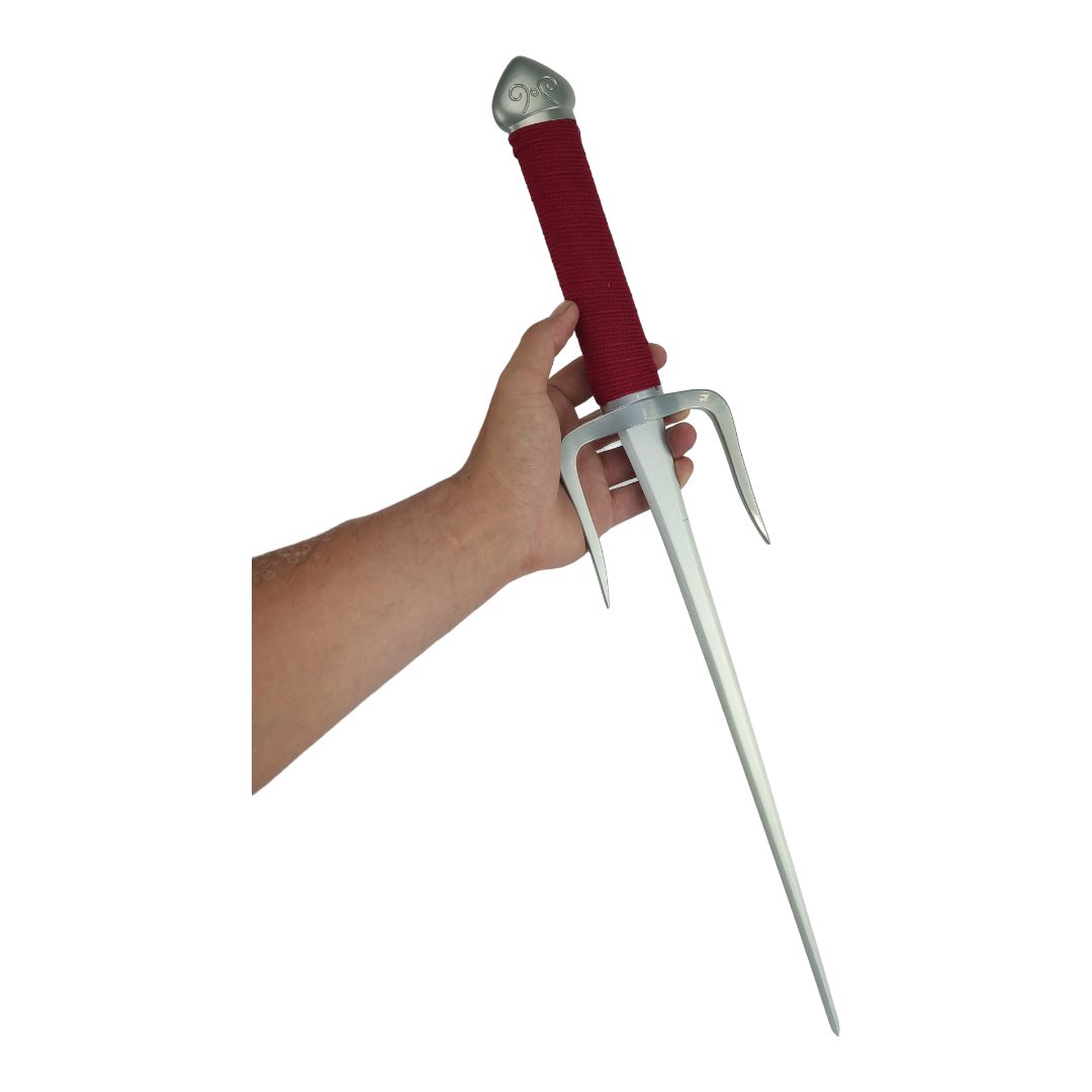 Réplica decorativa do Sai do Raphael, inspirado no icônico personagem das Tartarugas Ninja. Possui lâmina em formato de tridente, pintura temática e cabo revestido em nylon vermelho. Ideal para decoração, coleção ou cosplay.