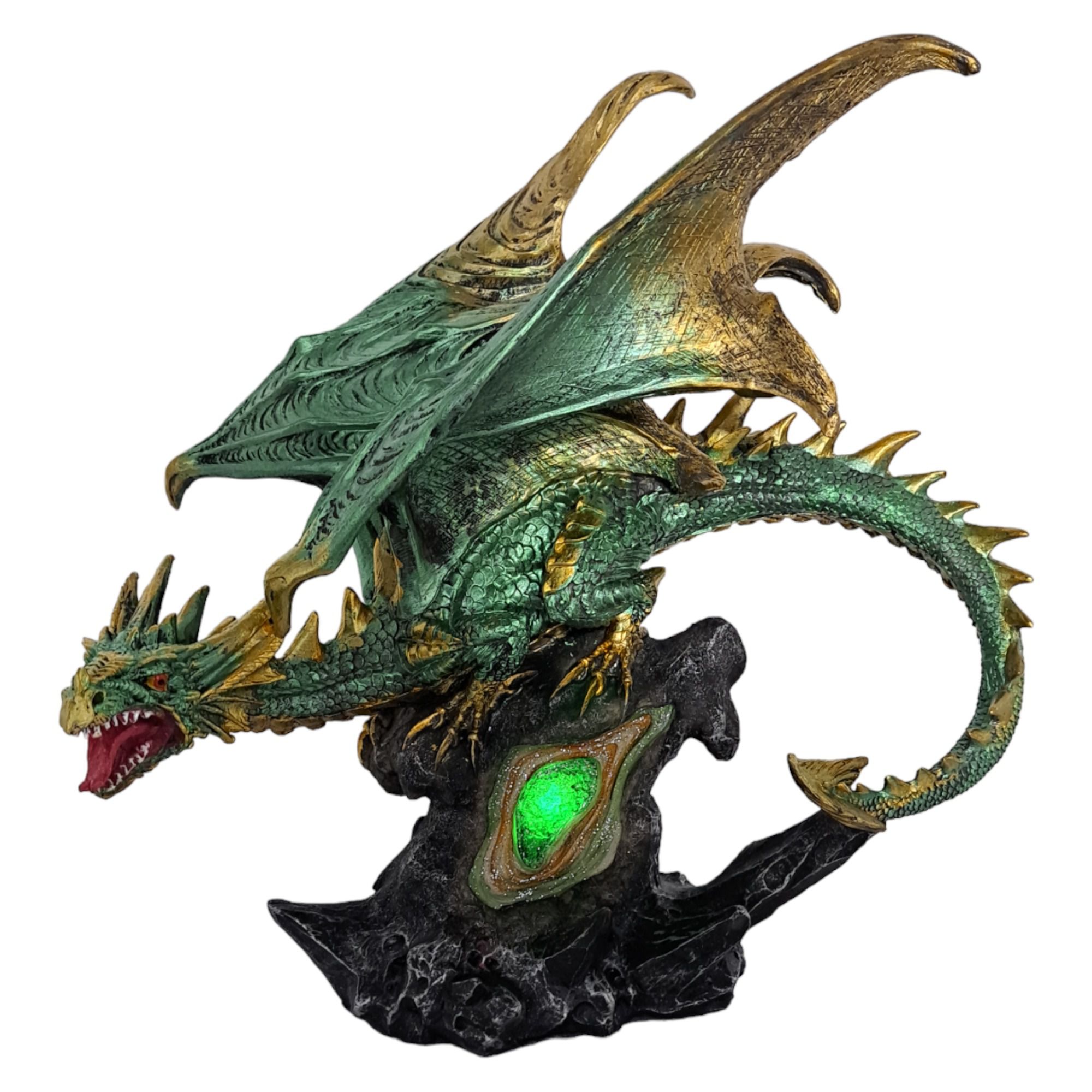 Uma peça encantadora que combina a majestade de um dragão. Este enfeite é esculpido com atenção aos detalhes e inclui iluminação LED para adicionar uma dimensão mágica. Deixe o brilho suave iluminar o seu espaço, enquanto o dragão protege o tesouro escondido. Adicione essa peça única à sua decoração e deixe a magia fluir através do seu ambiente.