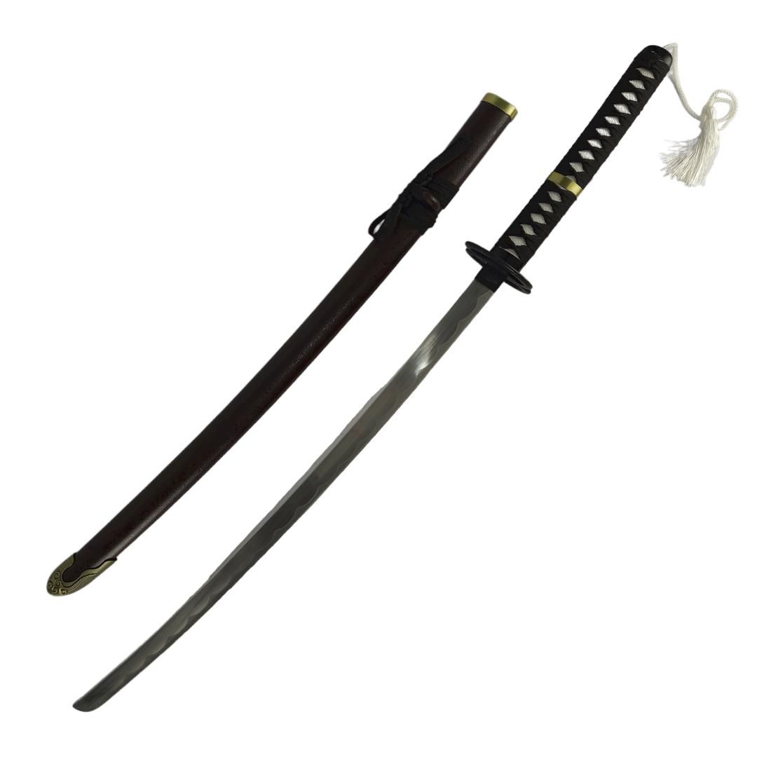 Katana linda, Sua bainha tem detalhes metálicos, sua empunhadura é revestida em couro e cordão trançado.