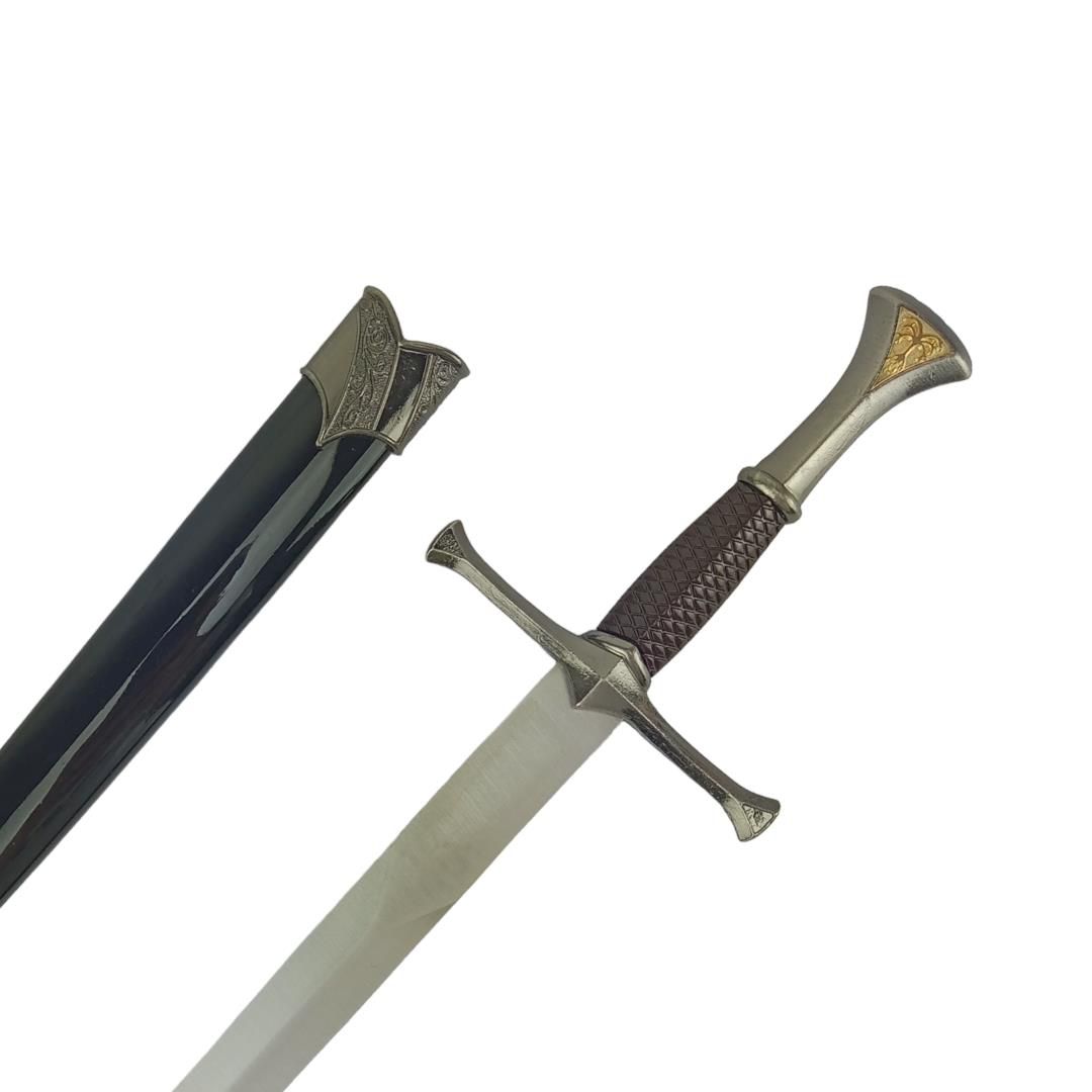 Réplica inspirada na espada Andúril, usada por Isildur em O Senhor dos Anéis. Possui guarda detalhada, cabo com formato de leque aberto e bainha preta com detalhes prateados em relevo. Ideal para decoração, coleção ou cosplay.